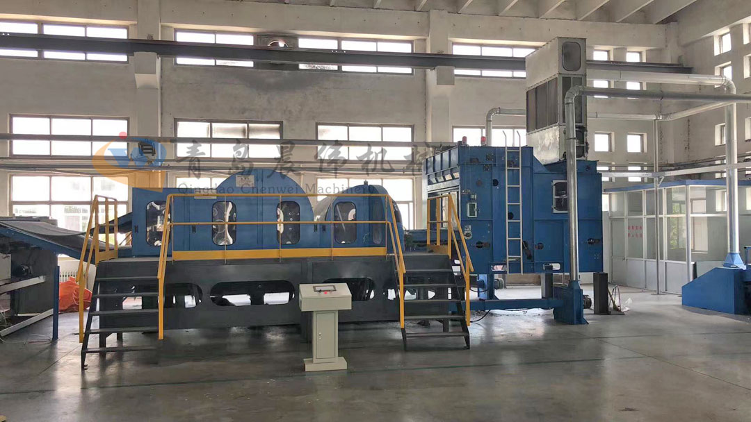 2. CWKS-開松機:各種不同纖維被放入水平輸送簾,經壓棉輥和對輥羅拉喂入,經高速打手開松后經輸棉風機以適量的風量輸送纖維原料供后道工作使用;并配備橋式除鐵裝備。開松效果好,不易纏棉,產量高。