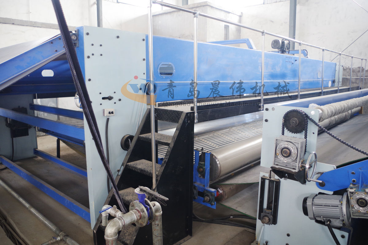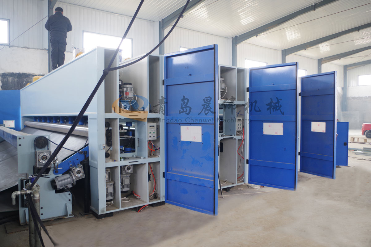 5. CWPW-鋪網(wǎng)機(jī):用于將梳理纖網(wǎng)通過(guò)移動(dòng)小車交叉折疊為所需幅寬和定量的多層纖網(wǎng),以供后道工序使用。鋪網(wǎng)輥采用特殊結(jié)構(gòu),加裝壓網(wǎng)輥和導(dǎo)流板,不飄網(wǎng)不起皺,五只大功率電機(jī)精確控制各部件的運(yùn)動(dòng),電動(dòng)輸出簾高度調(diào)節(jié)裝置